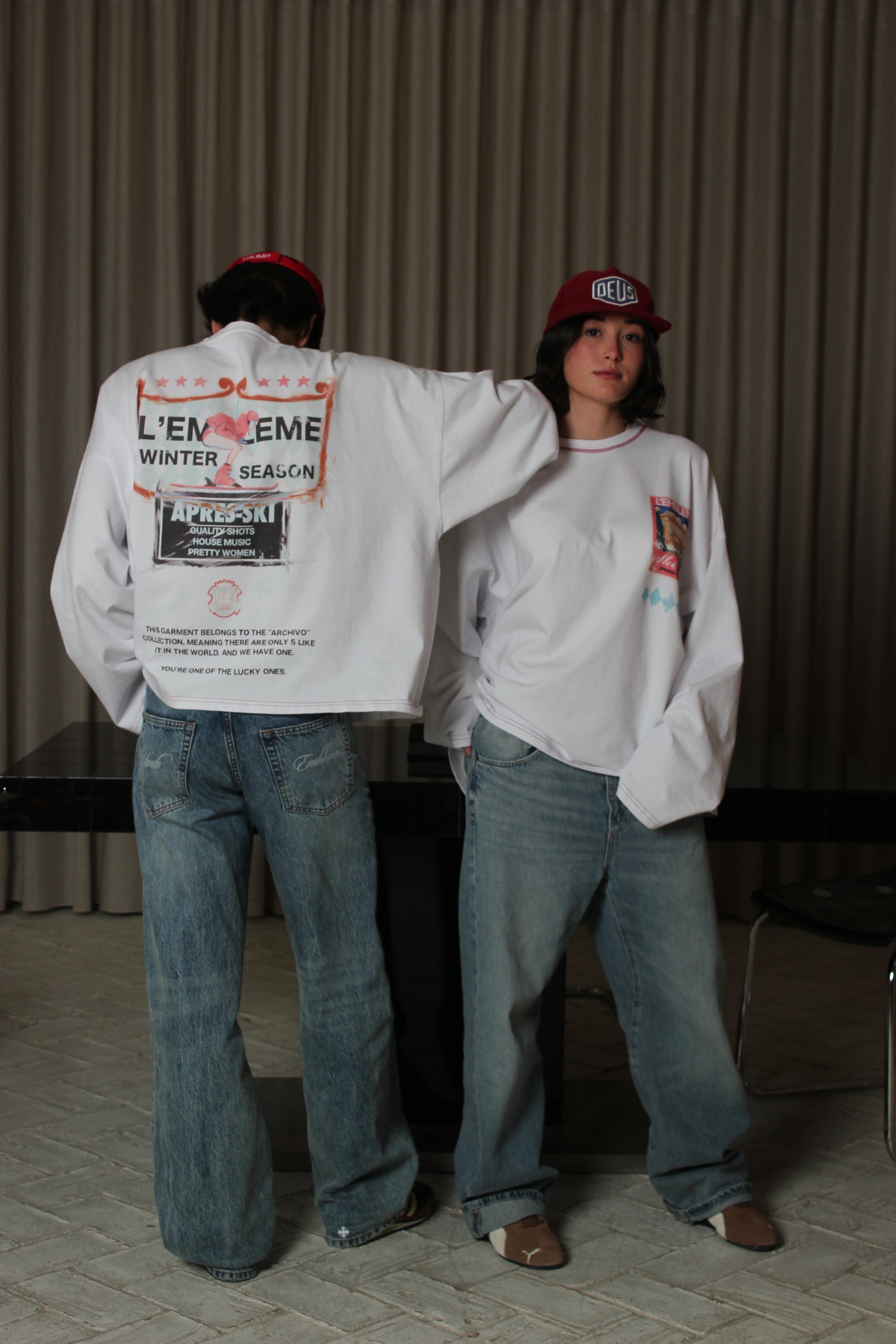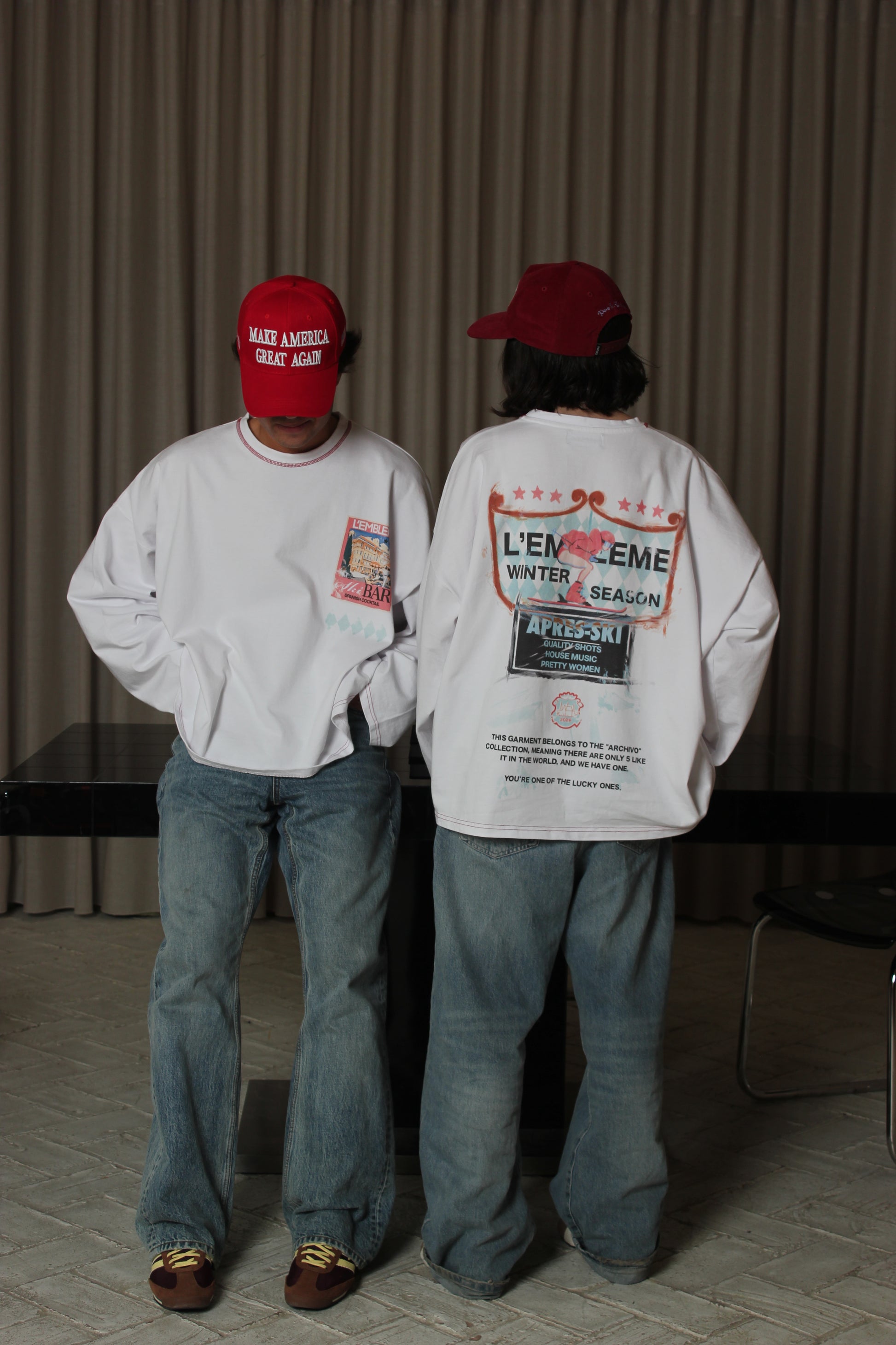 The graphic is hand-painted with an old brush, recreating a skier's descent into après-ski fueled by party energy and full attitude.